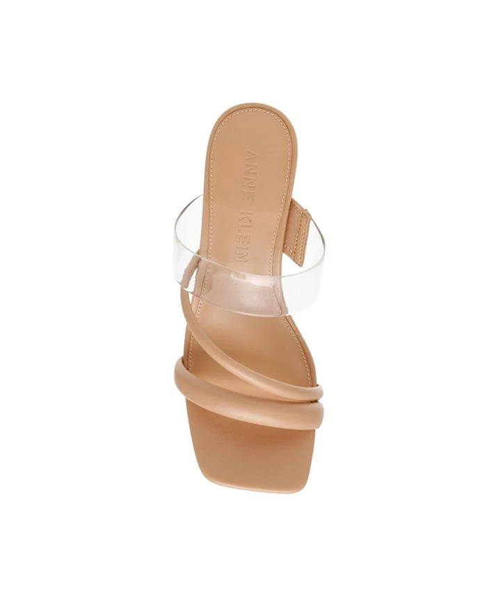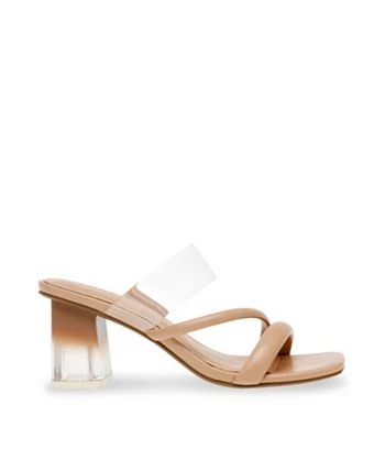 Start the conversation with this easy slide on sandal with the use of Clear vinyl or patent upper and sculptured lucite heel with graduated color.
