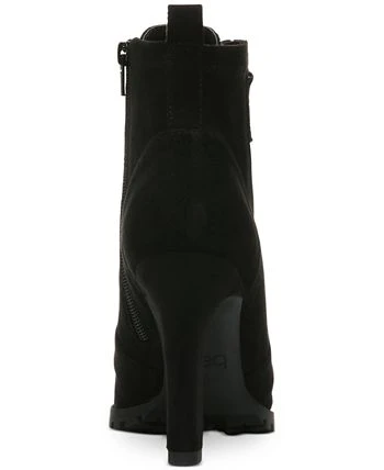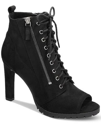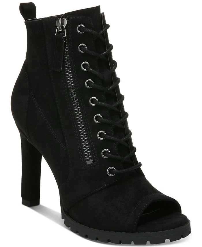 Open-toe flash, edgy hardware, high heels and lug soles accent the lace-up look of the Damas zip shooties from Bar III.
