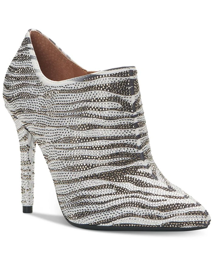 Striped in contrast and sparkling rhinestones, the Luela ankle booties from Jessica Simpson elevate a dressy look on sleek stiletto heels.