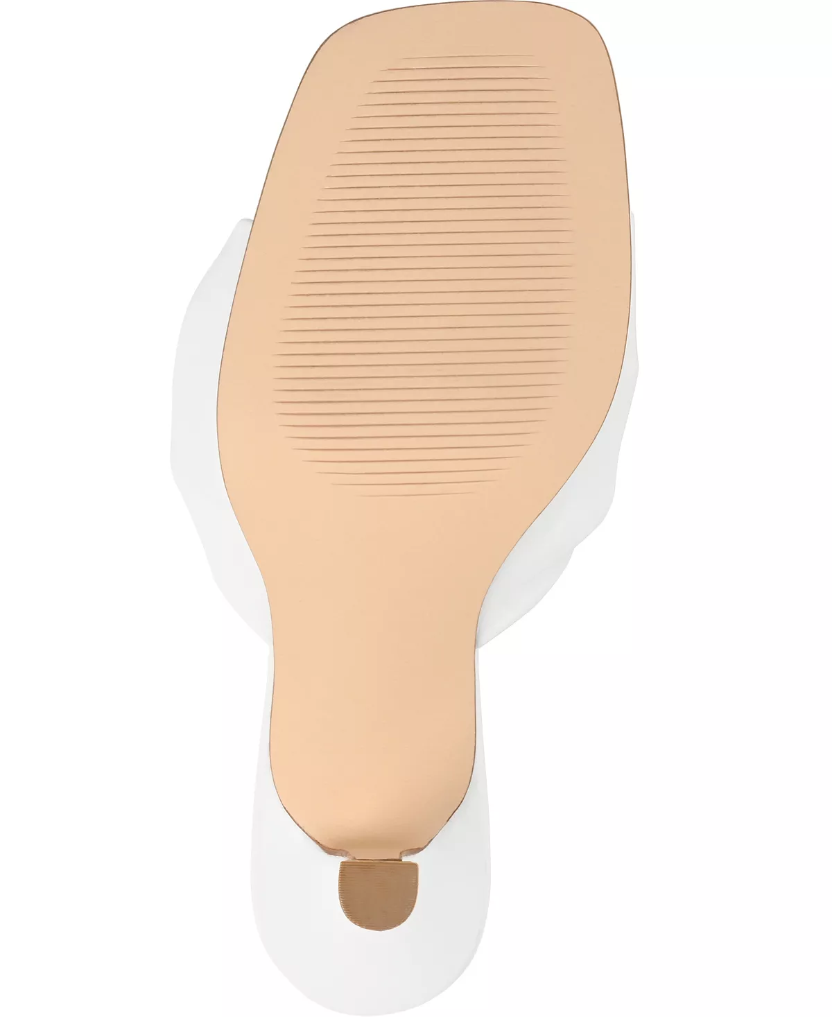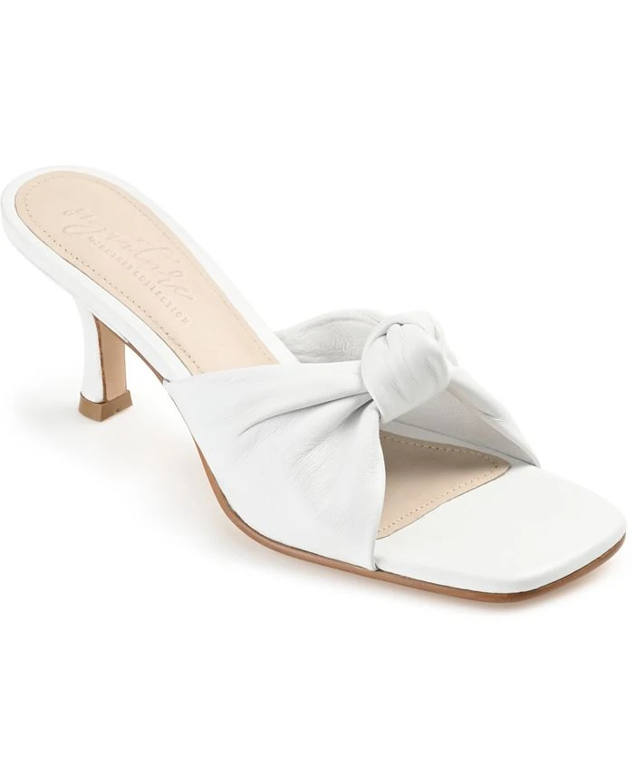Make your mark this season with the Finlee by Journee Signature. This slip-on heel features a single band at the vamp detailed with a knot accent and open toe. Genuine leather shapes the look, and a thin stiletto heel paired with a 4mm tru comfort foam insole elevates the look.