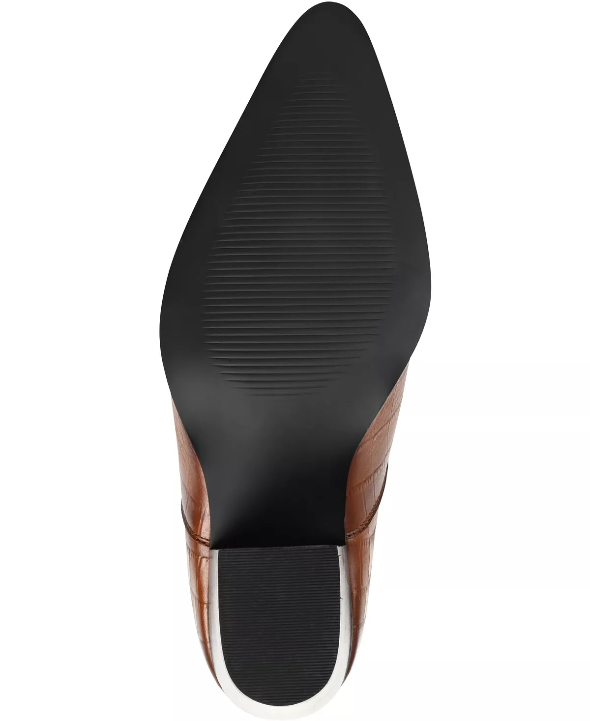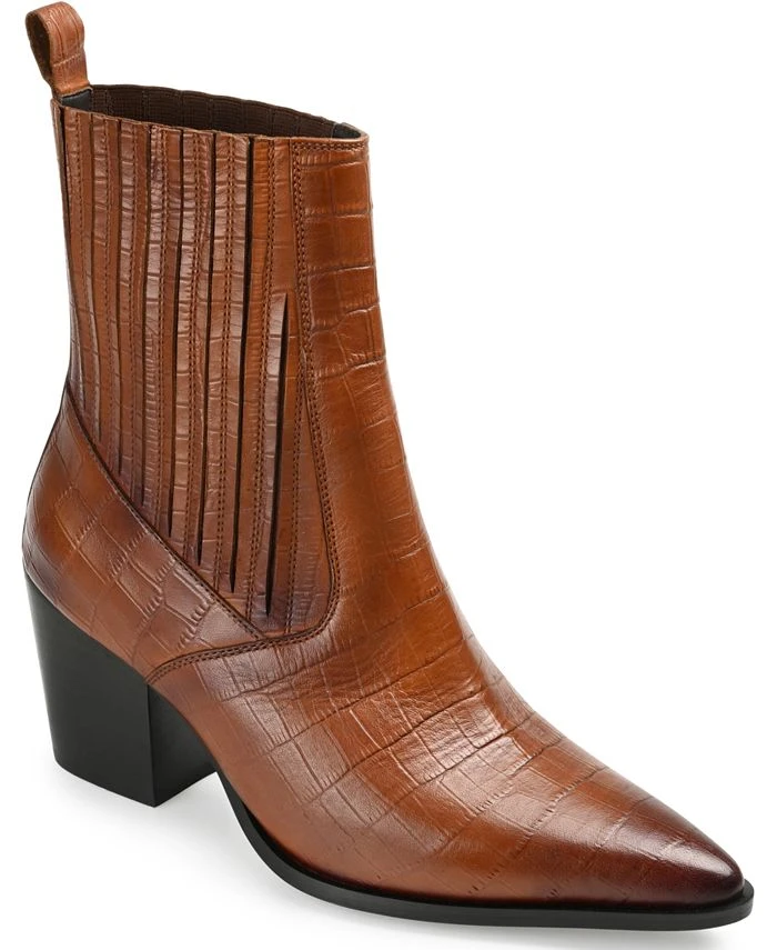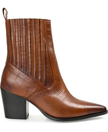 Booties that have a point to make, the Markka by Journee Signature. This silhouette borrows design elements from the west with covered stretch gore and with a croc texture throughout. A 4mm tru comfort foam insole lines the footbed, and a dark block heel elevates the look.