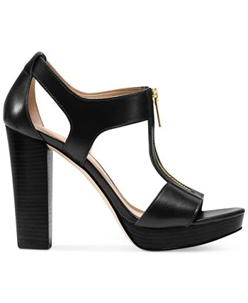 - Almond open-toe T-strap platform sandals with front zipper closure