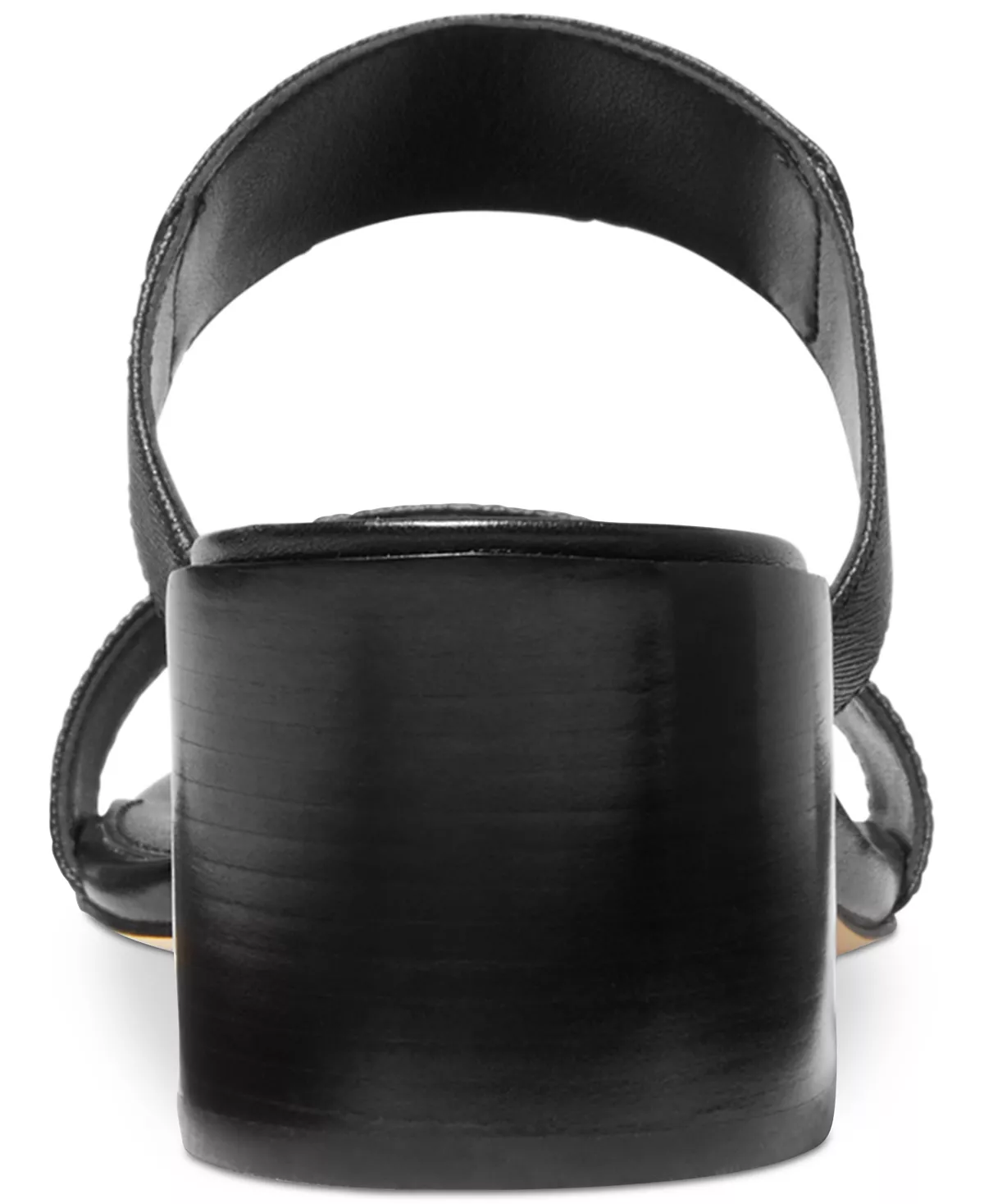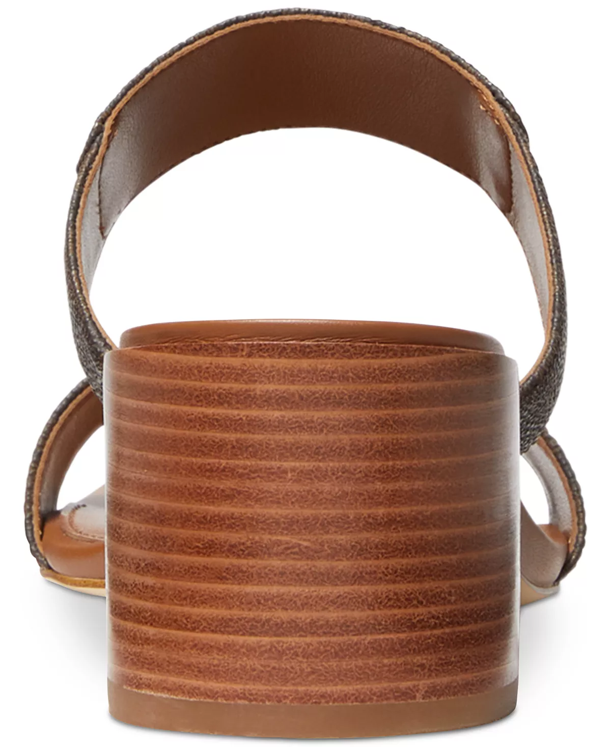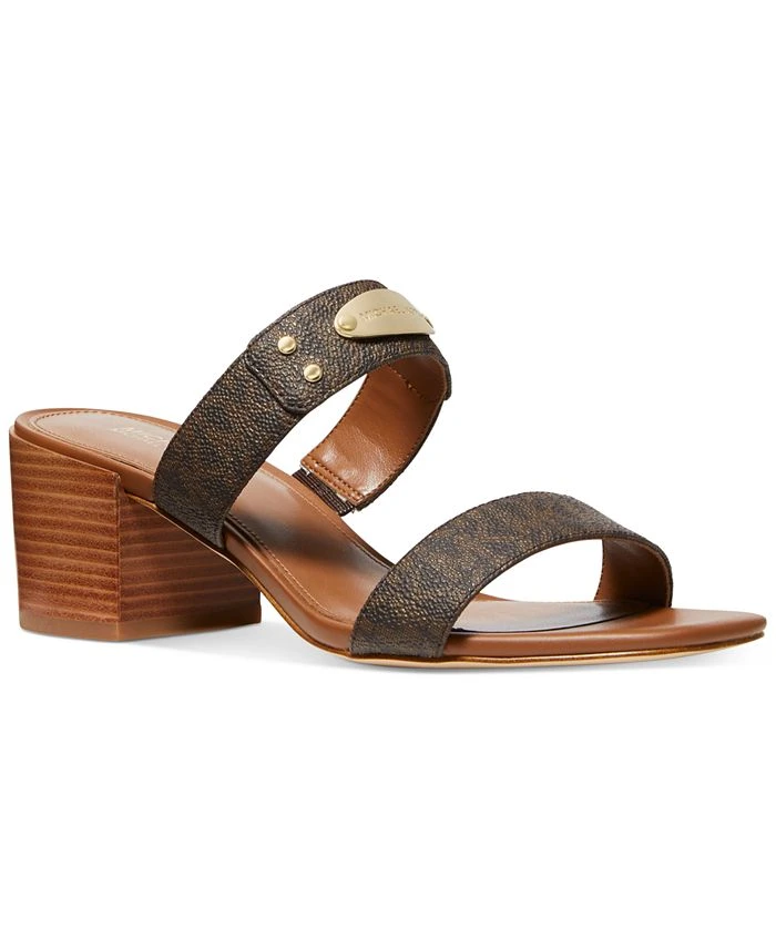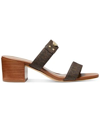 A simple two strap design gets signature style and dressy lift in the cool MK Plate slides from MICHAEL Michael Kors.