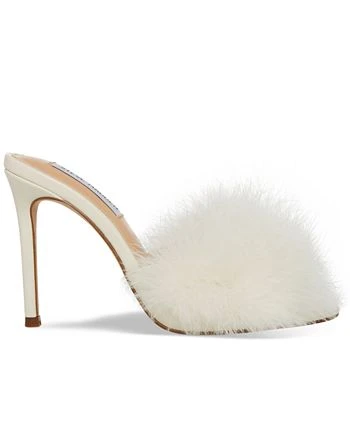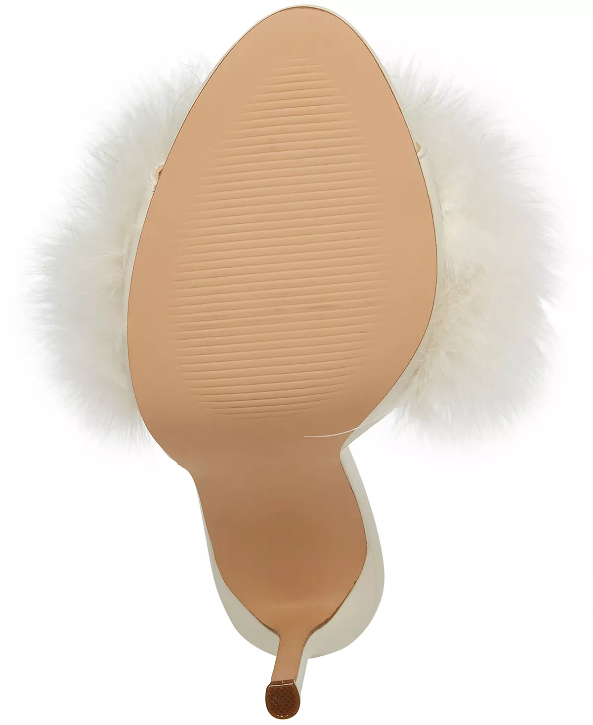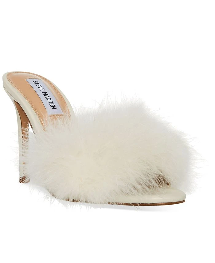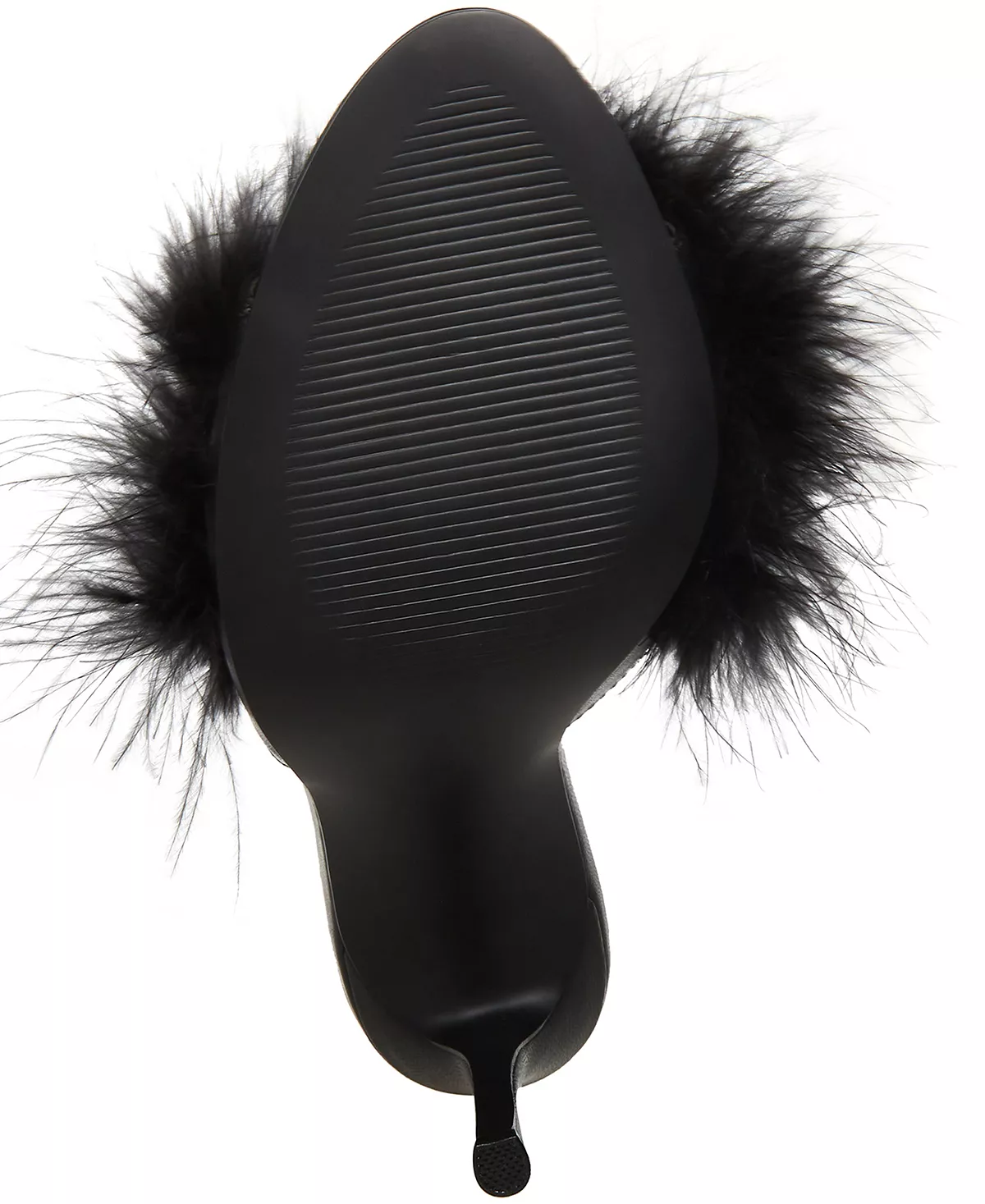 A puff of fluffy feathers adds fun dimension to a sleek slip-on silhouette and stiletto lift in the Spin sandals by Steve Madden.