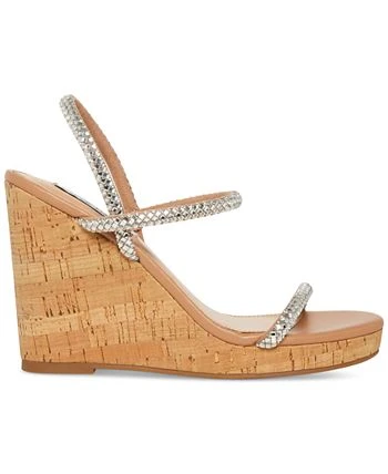 Rhinestone covered straps add striking sparkle to a cork-like platform wedge in the updated elegance of Steve Madden’s Udell sandals.