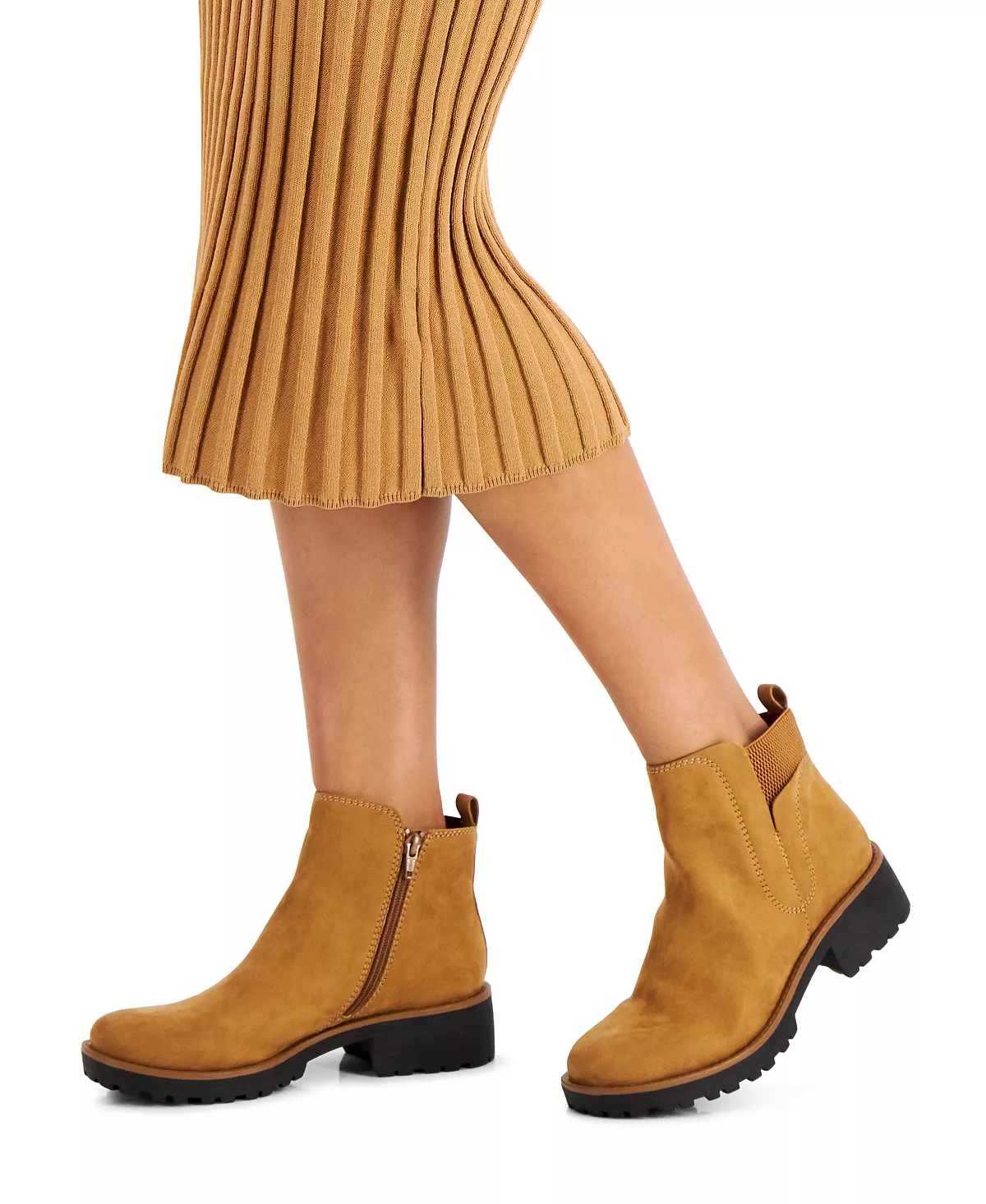 Sun + Stone’s Kandy booties ground a stylish Chelsea look with a chunky lug platform and the comfort of stretch.