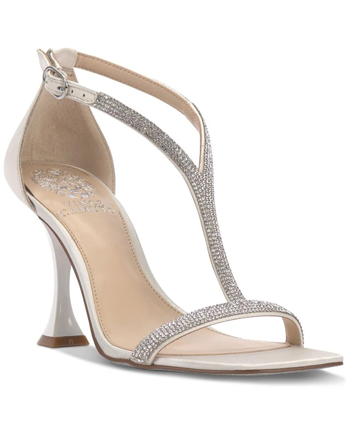 Sparkling T-straps create elegant shimmer atop curvy heels in the gorgeous Sorthanda sandals from Vince Camuto.